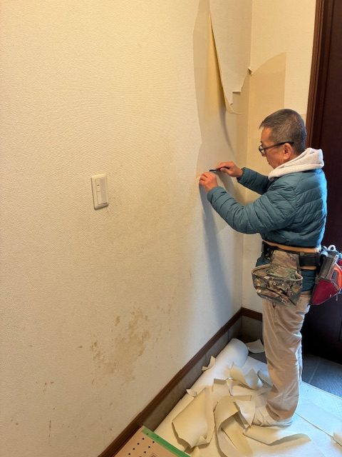 クロスの張り替えの為、既存のクロスをめくっています。【担当:村田】