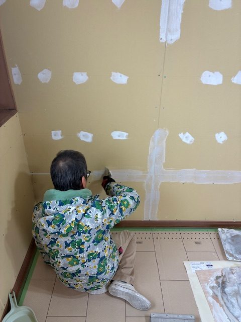 クロスを貼るのに伴い、パテをしています。【担当:村田】