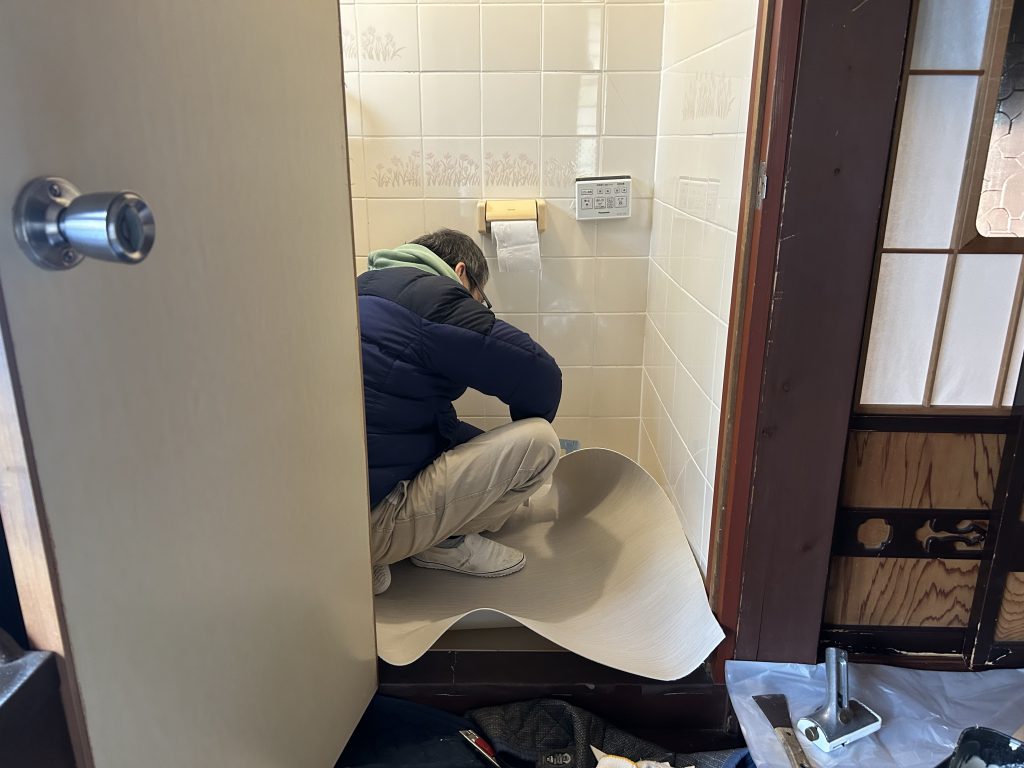 トイレを外して床のクッションフロアを貼り替え中です。【担当:西原】
